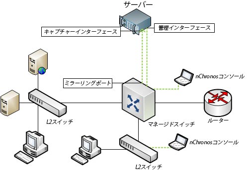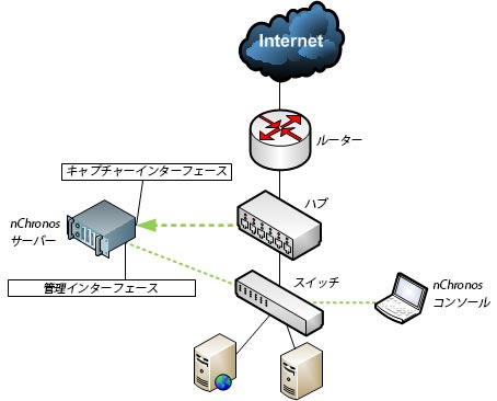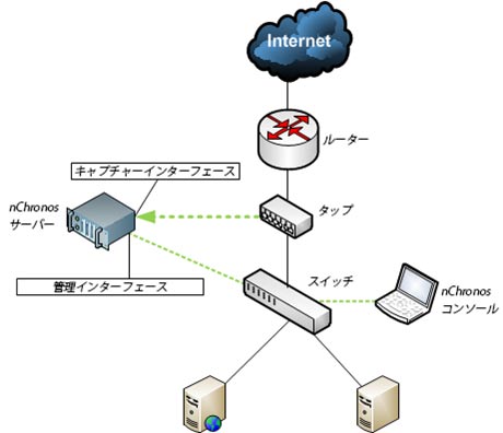 異なるネットワークと複数ネットワークリンクを持つネットワークでは、nChronosはローカルネットワークのネットワークデータをキャプチャーまたは保存するほかに、分散的デプロイメントとリモート監視をもサポートしています。nChronosのデプロイメントは、下図のようです。