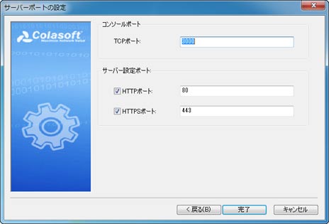 2、「次へ」をクリックすることによって、ポートを設定するページが表示されます。下図のように、TCPポート(デフォルトでは3000である)、HTTPポート(デフォルトでは80である)、また必要な場合にHTTPSポートを入力します。