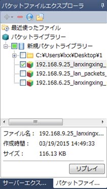 パケットファイルをリプレイするには、「直接パケットファイルをリプレイ」と「パケットライブラリーからパケットファイルをリプレイ」という二つの方法があります。