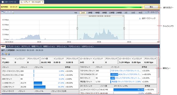 リプレイウィンドウは、進行状況バー、タイムウィンドウパネル、および解析ビューパネルから構成されています。進行状況バーは、リプレイ中のみ表示され、リプレイが終わった10秒後に消えます。リプレイ中、進行状況バーにおける「停止」をクリックして、リプレイを停止することができます。