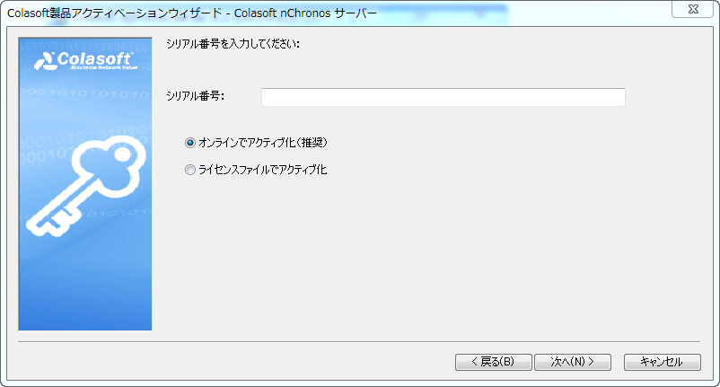 「オフラインでアクティブ化」とは、インターネット接続していなくても、Colasoftのシリアル番号、マシンコード及びシリアル番号、マシンコードによるライセンスファイルを使って、nChronosサーバーをアクティベーションできます