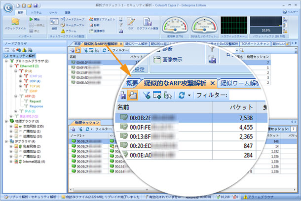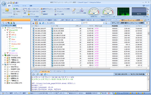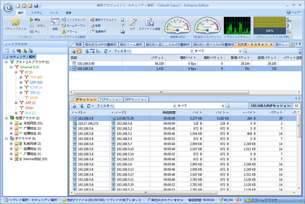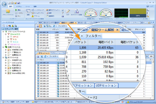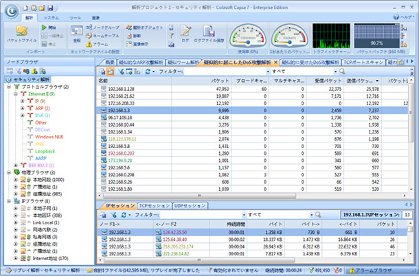 Capsa は脅威に対し独自のパラメータを設定することによって、もっと正確にこれらの脅威が認識 できるようになります。Capsa は上記の脅威を検出すると、送信元と送信先のIPアドレスを表示すると同時にメインスクリーン上の対応するタブ上に統計データを表示します。IPアドレスが表示されると、ネットワーク管理者はデバイスの物理的な場所を特定し、ネットワーク上から切り離し、悪意のある攻撃を阻止する必要があります。