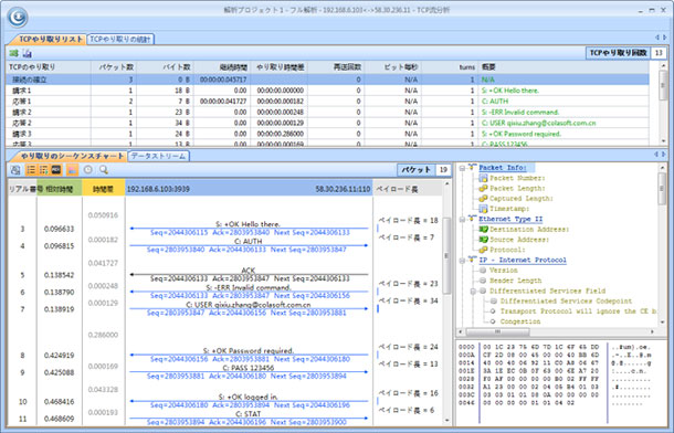 高度なTCPトランザクション解析は、ICQチャットモニタリング機能とともに、Capsa に装備された新機能です。TCP(Transmission Control Protocol:伝送制御プロトコル)は、信頼性の高い接続指向型プロトコルとして設計されていますが、認証を用いて、すべての単一のビットが、受信者に配信されるようにします。TCPのいくつかの機能を、ネットワーク 解析に利用することができます。特に、ネットワークの応答が遅い場合のトラブルシューティングに利用することができます。TCPトランザクションパターンを解析することで、以下の内容を取得することができます: