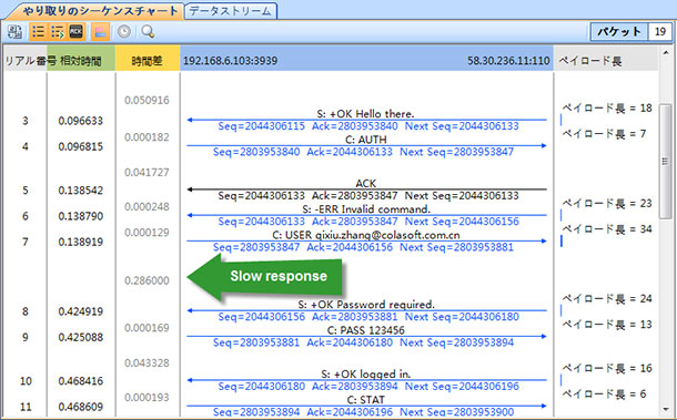 ネットワーク解析とネットワークのトラブルシューティングについては、TCPパケットにより、 ネットワークが遅くなった場合のトラブルシューティングに役立つ情報を提供します。特に、ウェブサイトの応答が遅い場合、遅いCRMトランザクション処理や、ダウンロードまたはアップロードが遅い場合などに役立つ情報を提供します。ネットワークが遅い問題を解決するための最初のステップは、クライアント、サーバー、またはネットワーク自体のいずれが、遅い応答を引き起こしているのか見当をつけることです。Capsa のTCPフロー 解析ウィンドウは、クライアントとサーバー間のリクエスト数と応答数の頻度に関する詳細、各トランザクションにおける時間遅延に関する詳細、およびトランザクションで運ぶデータ量の大きさに関する詳細を提供します。それらすべてが、ダイアグラム(図式)にはっきりと示されています(以下の図)。