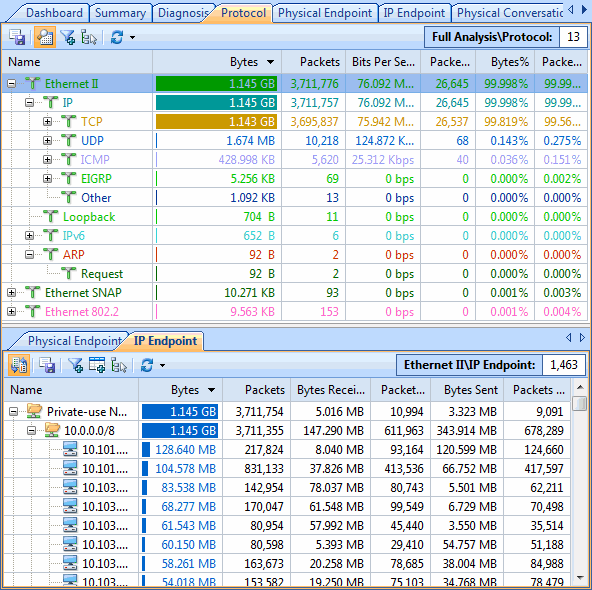Capsaのプロトコル分析能力により、我々はネットワーク上で何が起こっているか、どのネットワークアプリケーションが最大のトラフィックを生成しているかを簡単に理解できます。これらの統計は、日常のネットワーク管理を実行するための直接情報を提供します。