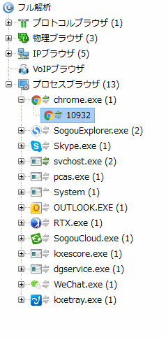 Capsa 9.0はプロセスビューを提供し、プロセス名とプロセスIDごとに、バイト、パケット、毎秒ビット、毎秒バイト、毎秒パケット、パスなどをリストすることで、ローカルプロセスのトラフィック情報を表示します。あるプロセスを選択することで、下の下位パネルはそのプロセスに関するプロトコルとセッション情報を表示します。あるプロセスをダブルクリックして、そのプロセスに関するパケットの詳細情報を表示するパケットデコーディングウィンドウが開かれます。