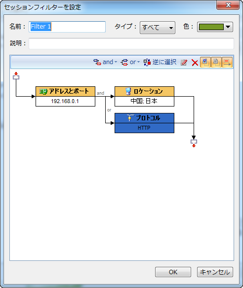 Capsa9.1はセッションフィルターを提供し、Capsaによりキャプチャーされたセッションのフィルタリングに役立ちます。セッションフィルターはMACセッション、IPセッション、TCPセッション、およびUDPセッションに適用します。Capsa9.1では、ユーザーはアドレスとポート、ロケーション、セッションプロトコル、セッションパケット、セッションコンテンツ、およびセッションオプションに基づき、セッションフィルタールールを設定することができます。すべてのルールはAND/OR関係で結ばれることができます。セッションフィルターが有効されると、設定されてセッションフィルタールールと一致しているセッションだけがセッションビューに表示されます。