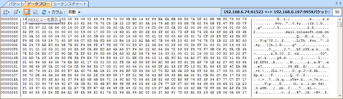 TCPセッションビューとUDPセッションビューにおけるデータフローサブタブでは、デコードされたデータのHex表示がサポートされています。ユーザーはhexとtextから表示フォーマットを切り替えることができます。