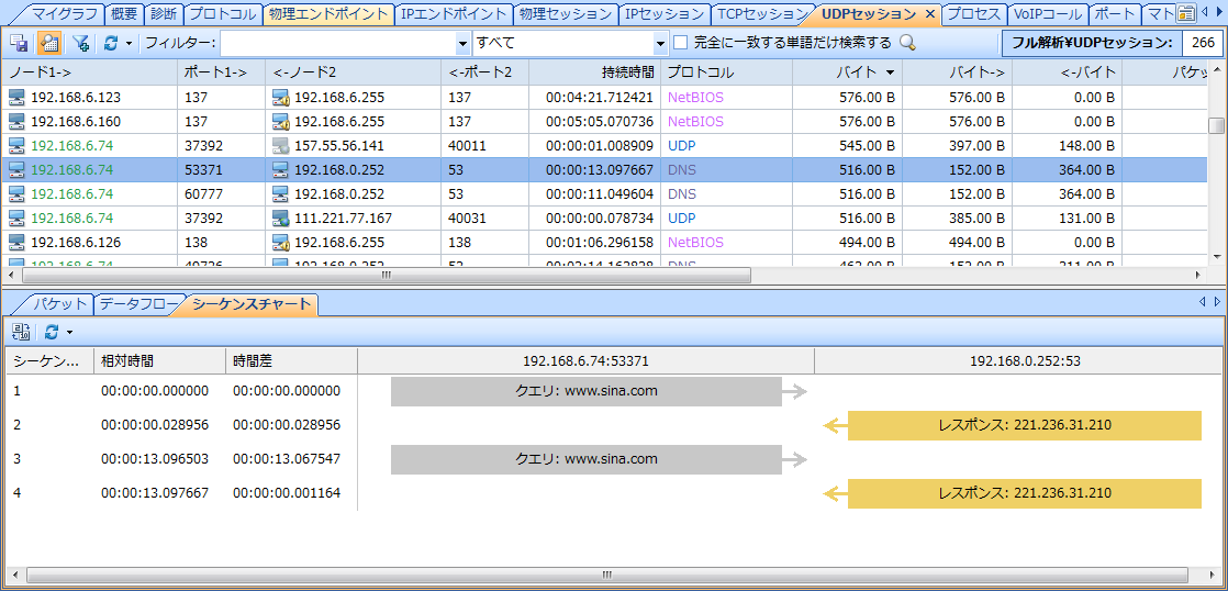 Capsa 9.1はDNSに基づくUDPセッションのために、タイムシーケンスタブを提供します。この機能を利用して、ユーザーは詳細なDNSドメイン名解決プロセスを確認することができます。