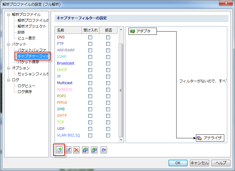 Step1.解析プロファイルをダブルクリックし、キャプチャーフィルタータブに移動して、追加ボタンをクリックします。