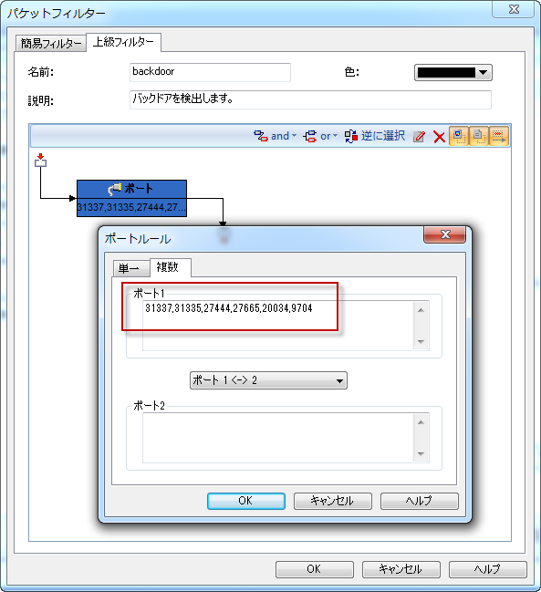 Step2.上級フィルターでポートルールを追加し、「31337,31335,27444,27665,20034,9704」のように複数のポートを入力します。
