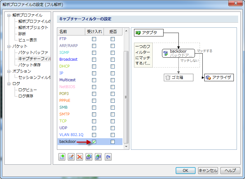 Step3.OKをクリックして、キャプチャーフェイルタータブに戻ります。下図のようにフィルターリストで「backdoor」を受け入れます。