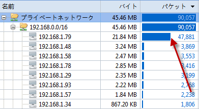 送信パケット、受信パケットまたはIP会話のコラムヘッダーをクリックすることで、行を並べ替えることができます。大きな統計量を持つノードに注意してください。これはBitTorrentのダウンロードである可能性がありますが、トロイの木馬とワームは間違いなく大量のパケットを送信しますので、その可能性もあります。