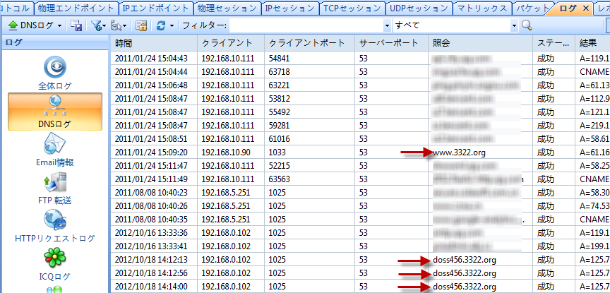 DNSログに注目してください。Googleでトロイの木馬のターゲットウェブサイトのリストを作ることができます。たとえば、*****.3322.orgのようなウェブサイトなど。さらに、DNSログを保存し、トロイの木馬のキーワードのフィルターを使用して解析することができます。