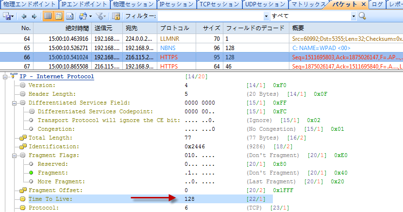 図1のとおり、TTL値は128です。上記リストのTTL値により、パケットは送信元からディスティネーションマシンまで経由したルータ数は255-128=127で、伝送状況は正常であることが判明できます。