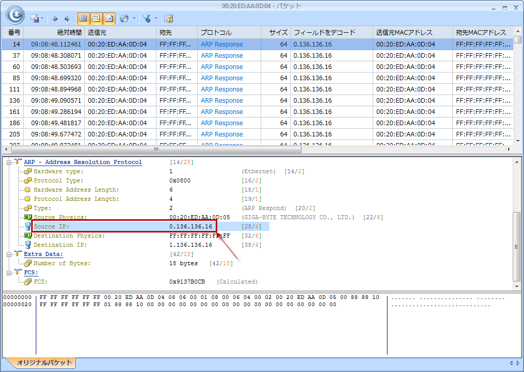 パケットリストでパケットを選択して、デコードビューで「Source IP」を確認したところ、偽のIPアドレス0.136.136.16が発見されます。つまりこのパケットに応答しているネットワーク上の任意ホストは正しくないまたは存在しないIPアドレスに送信され、ARP攻撃を引き起こします。