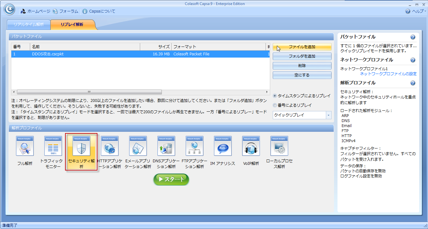 Capsaを起動して、セキュリティ解析という解析プロファイルを選択します。セキュリティ解析プロファイルには、受けたDoS攻撃ビューが提供されています。お使いのネットワークがDoS攻撃された場合、攻撃に関する詳細情報は受けたDoS攻撃ビューに表示されます。
