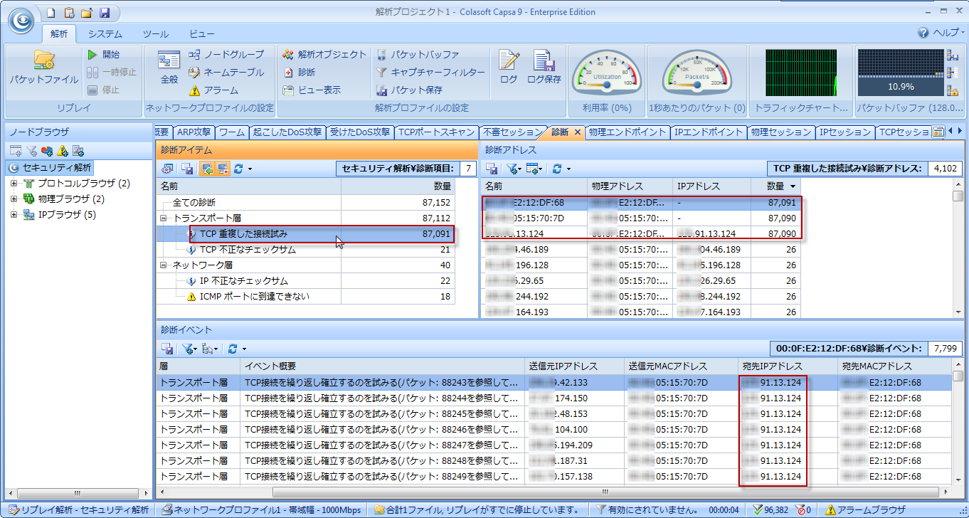 次に診断ビューに移動します。診断アイテムを確認したところ、ほとんどの診断イベントは「TCP重複した接続試み」であることが分かりました。そのアイテムを選択して、右の「診断アドレス」で一番多いアイテムは三つであることが分かっています。どのアイテムをクリックしても、下の「診断イベント」タブにおける「送信元IPアドレス」は異なっていますが、「宛先アドレス」は全部「×××.91.13.124」であることは分かりました。つまり、誰かが「×××.91.13.124」というアドレスにTCP接続を繰り返し試みていることで、DDoS攻撃を起こしています。