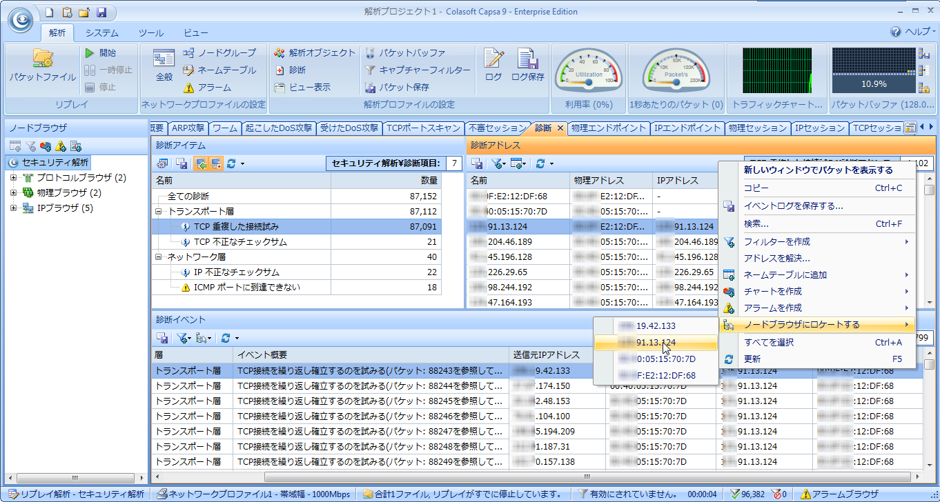 「診断イベント」タブで右クリックして、「×××.91.13.124」というアドレスをノードブラウザにロケートすることで、そのアドレスの具体的な情報を見てみましょう。