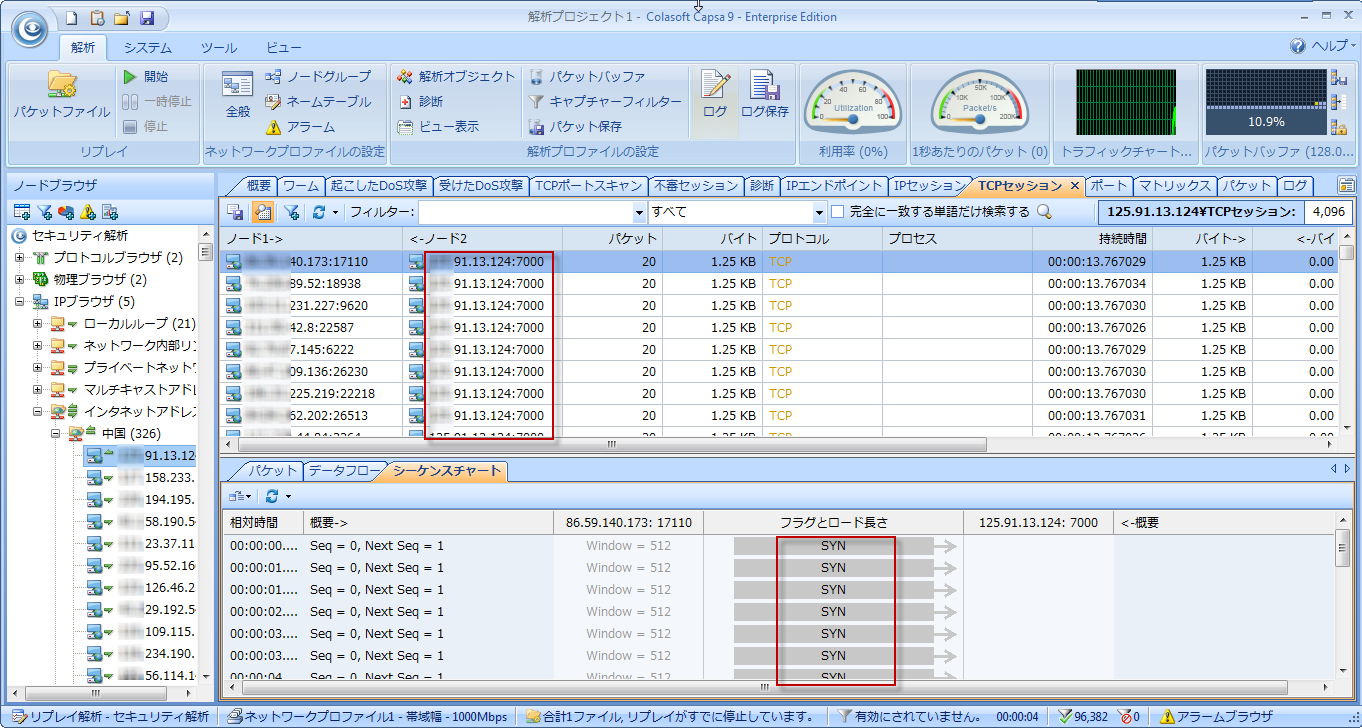 TCPセッションビューを見ると、送信元アドレスは全部ポート7000を通じて、「×××.91.13.124」に接続をリクエストしていることが分かりました。だから今回の例の解決方法の一つとして、ポート7000を閉じることができます。そして、下のシーケンスチャートタブを確認して、どのTCPセッションにも「SYN(接続リクエスト)」しかなく、「ACK(接続確認)」がありません。その繰り返しの接続リクエストがネットワークに負荷をかけるのです。