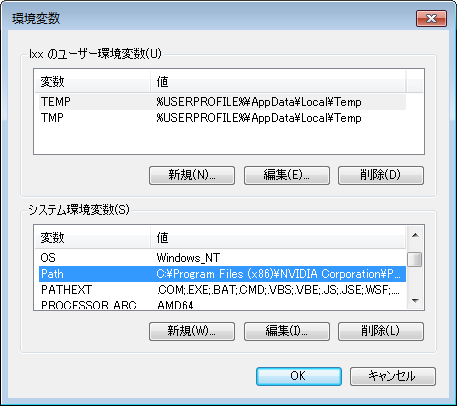 3. 環境変数をクリックして、下図のように環境変数ダイアログボックスが開かれます。
