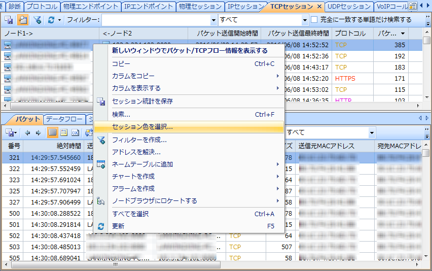 以下はTCPセッションを例にします。まずTCPセッションビューでセッションを右クリックし、ポップアップされたメニューで「セッション色を選択」をクリックします。