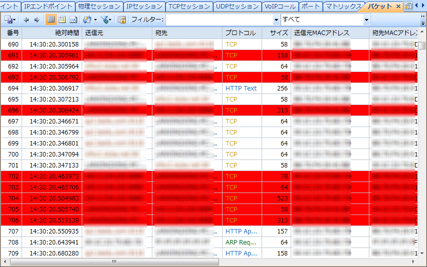 色が設定済みになったら、パケットビューにおいて、そのセッションに関連するパケットは下図のように設定された色でハイライト表示されます。