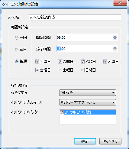 タスクを自動的に実行するために、解析プロファイル、ネットワークプロファイルとネットワークアダプタを指定する必要があります。Capsaは事前に指定された時間帯に実行するとき、利用するのは選択された解析プロファイル、ネットワークプロファイルとネットワークアダプタです。従って、事前に解析プロファイルにキャプチャフィルターを定義すると、自動的にキャプチャを開始するとき、定義された通りに実行できます。